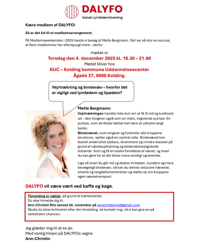 De sidste mange år har vi afholdt en medlemsweekend i marts måned i forbindelse med vores generalforsamling. Herudover laver vi webinarer og fysiske medlemsmøder rundt om i landet, hvor vi har et bestemt tema på programmet, der giver inspiration til livet med lymfødem og lipødem.